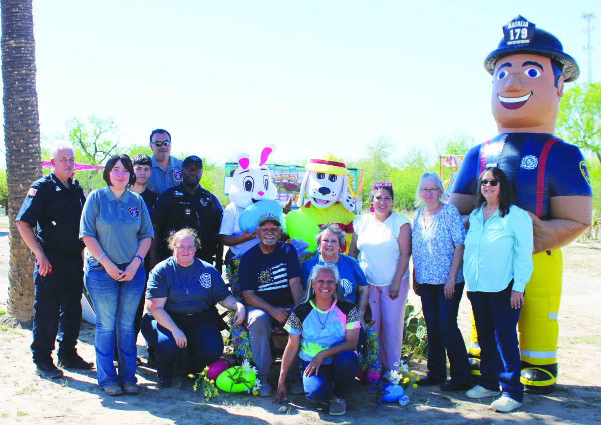 Thank you to this group of people who organized the NMDD Easter Egg Hunt in Natalia this past Sunday, March 22. Standing (l to r) Daniel Orr (NVFD), Brandi Byrd (NVFD), Eugene Sanchez (NVFD), Anthony Bollman (NVFD), Natalia PD Officer Gary Rogers, Easter Bunny Samantha Morales, Sparky Starlett Byrd, Stephanie Solis, Brenda Fernandez, Dorothy Woodson and Rookie Justin Byrd. Front row Beatrice Morales, Mayor Tommy Ortiz and Ruby Vera.