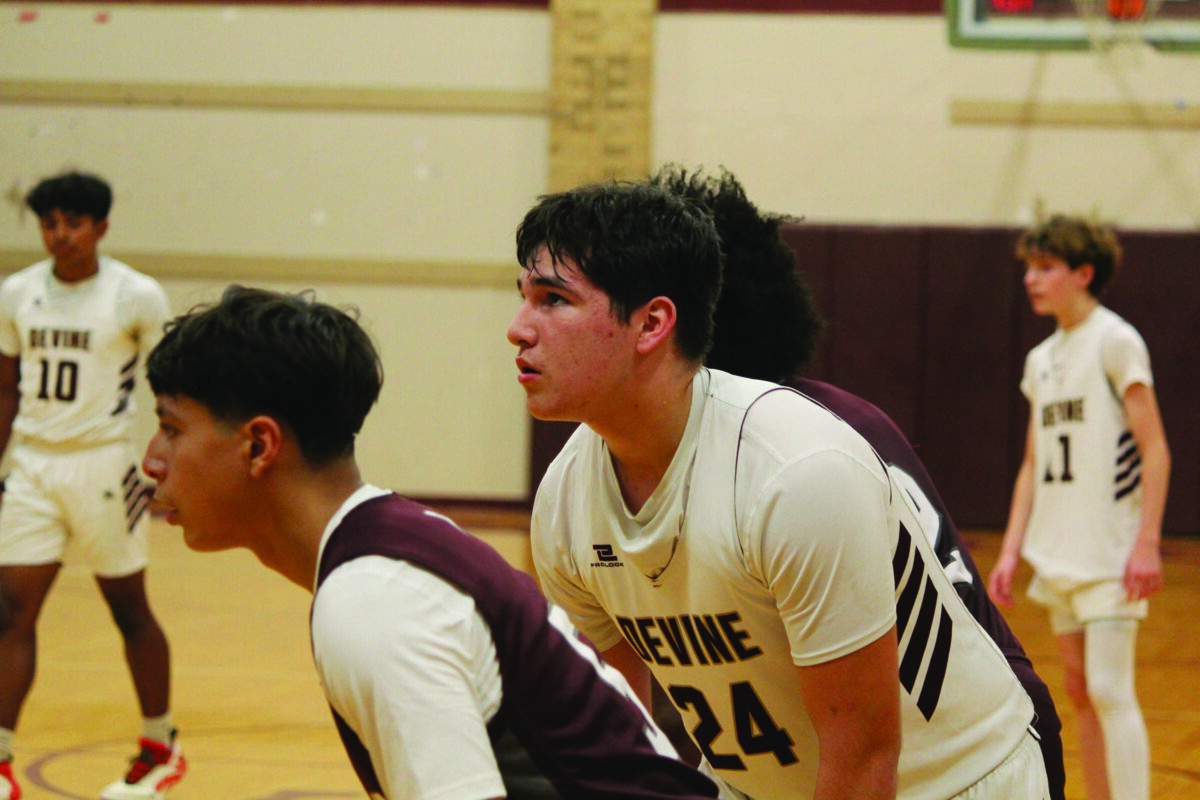 Freshman Warhorse #24 Bryan Martinez prepares to boxout for the rebound during Devine’s game against Highlands. Photo by Moose Lopez.