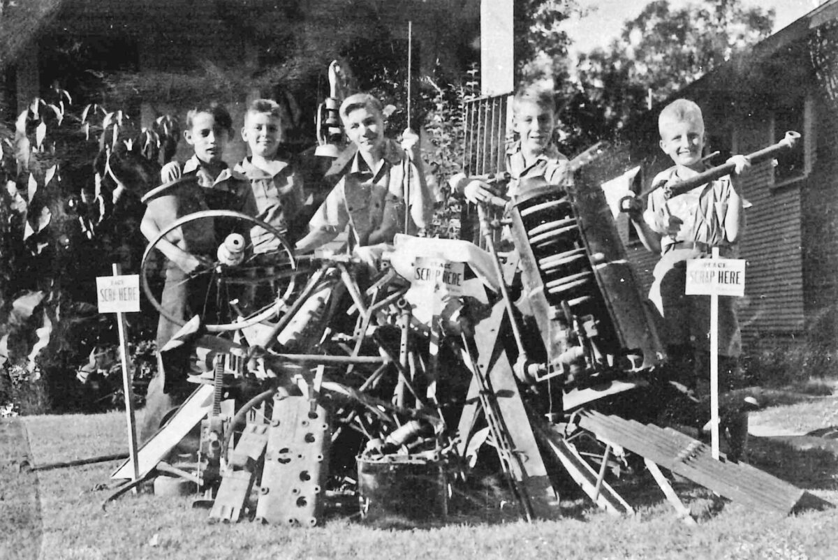 “We would go from home to home asking ladies if they had any pots and pans they didn’t use or any kind of scrap metal or steel,” Bottoms recalls. “In the picture you can see an old lantern, bicycle rim, hot water heater, and car parts. We would take it to the drop off site, and the Army would pick it up and melt it down to be used for guns, airplane parts, whatever they needed.”