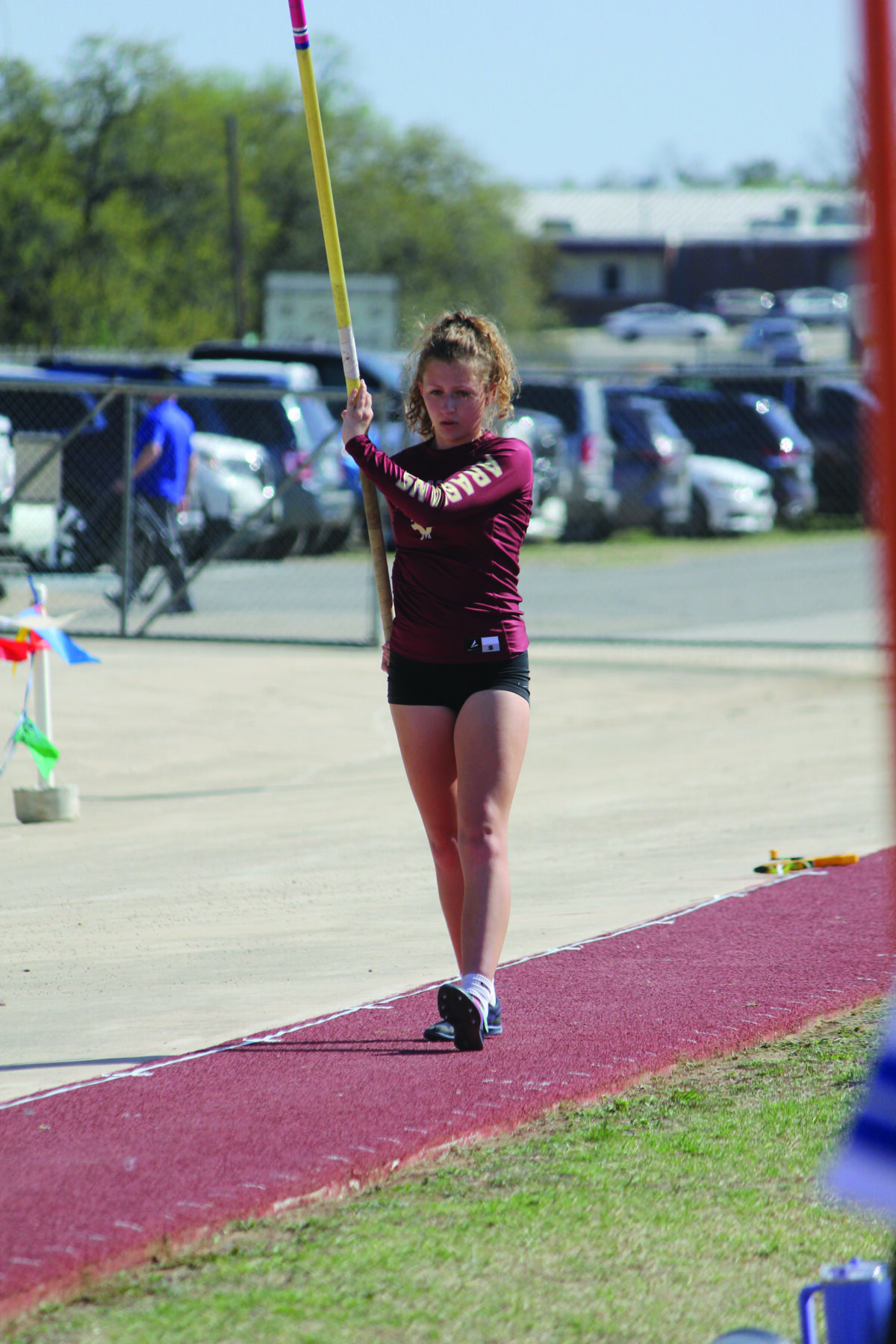 Arabian Caroline Suhr focuses on her run during the pole vault event at Devine’s home track meet. Photo by Moose Lopez.