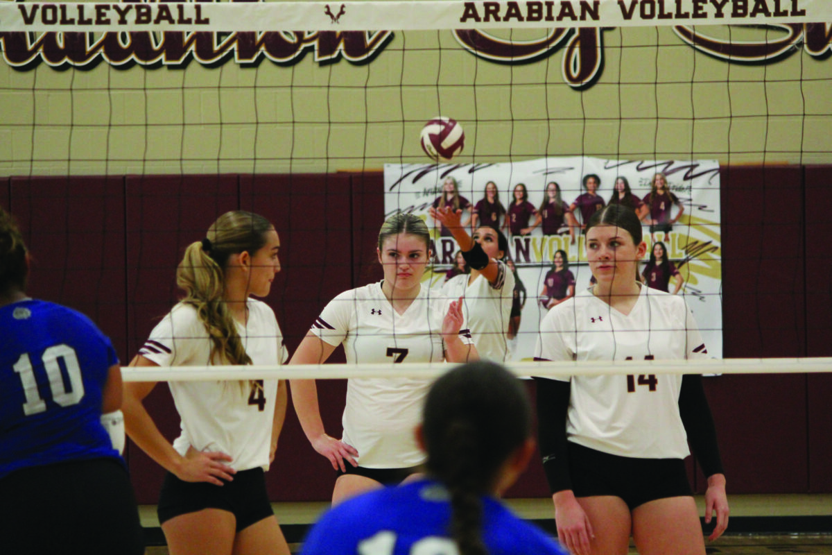 Varsity Arabians Rylie Wells, Emma McIver and Kyrie DuBose stand ready at the net while Bella Flores tosses up a serve in a thrilling match against Somerset. Photo by Moose Lopez.
