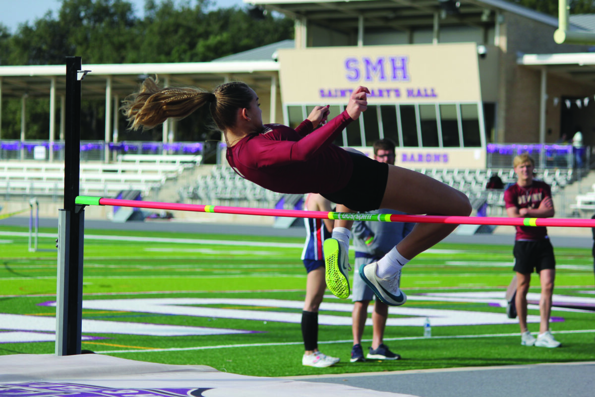 Arabian Rylie Wells leaps over the pole during the high jump event at St. Mary’s Hall. Photo by Moose Lopez.