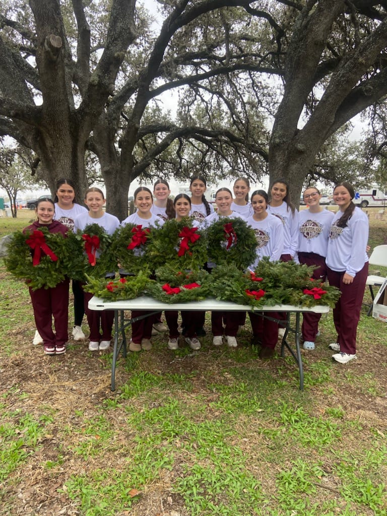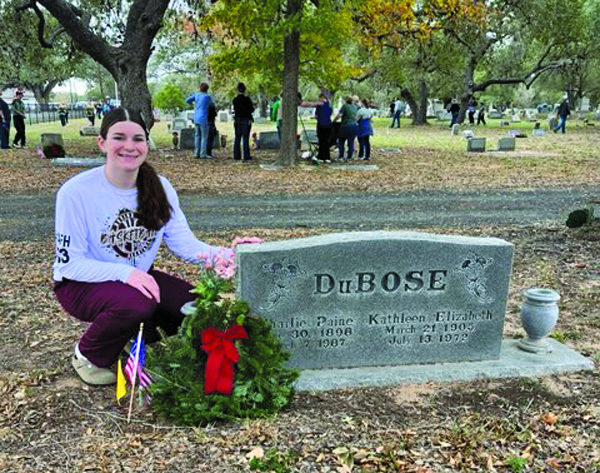 Placing a wreath on her great grandpa’s grave a WW1 Navy Veteran is Kyrie DuBose one of the many DHS student helping out at the Wreaths Across America Ceremony last Saturday in Devine