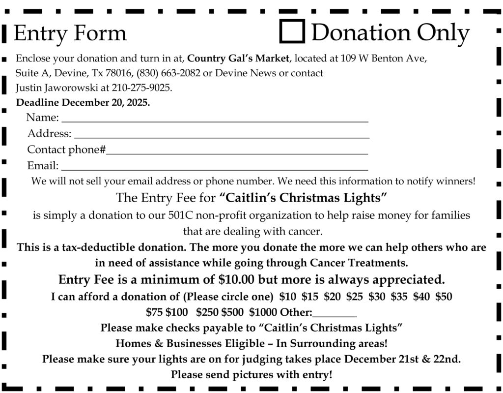 Sign up in person at Country Gal’s Market located at 109 W. Benton Ave, Devine, TX 78016 or call Justin Jaworowski 210-275-9025.