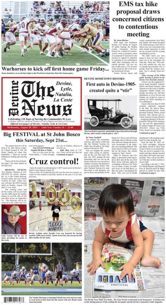 By Anton Riecher With anger and frustration boiling over during an August 20 public hearing, the Medina County Emergency Services District No. 4 Board of Commissioners voted to postpone action on a proposed 57 percent tax rate increase to support its transition to operating its own ambulances rather than contracting with an outside provider. The new tax rate would cause a 73% increase in the actual tax bill of the average homestead will pay. Former Devine mayor and county commissioner Jerry Beck and Natalia ISD board president Eric Smith among a room full of others were very concerned in the often heated opposition to both the tax increase and the revamp of ambulance service. “We didn’t know you were going to raise our taxes until it came out in the newspaper the other day,” Beck said. “We wanted to ask, number one, why, but it’s already been decided. You’ve already fired the contract company. You’ve already hired new people.” Video coverage of the ESD4 public hearing is posted on the Devine News YouTube channel. Friction was also apparent between board president Anthony Martin and board treasurer Juan Zamora over the issue of whether…