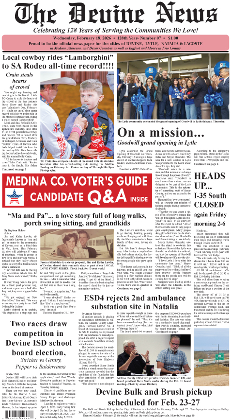 LOGIN at www.DevineNewsMembers.com to read the E-edition. If you sign up, you will get the newspaper mailed to your home and full online access for only $36 a year in Medina County or $48 out-of-county.