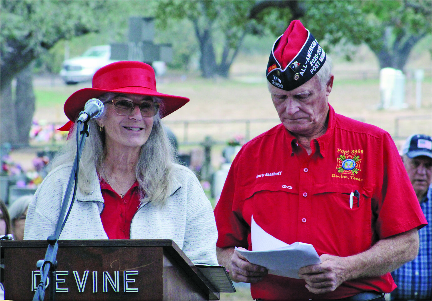 Gary K. Saathoff of Veterans of Foreign Wars Post 3966, left, and Martha Wall of the Devine Current Events Club preside over National Wreaths Across America ceremonies in Devine Sunday.  (Photo by Anton Riecher)