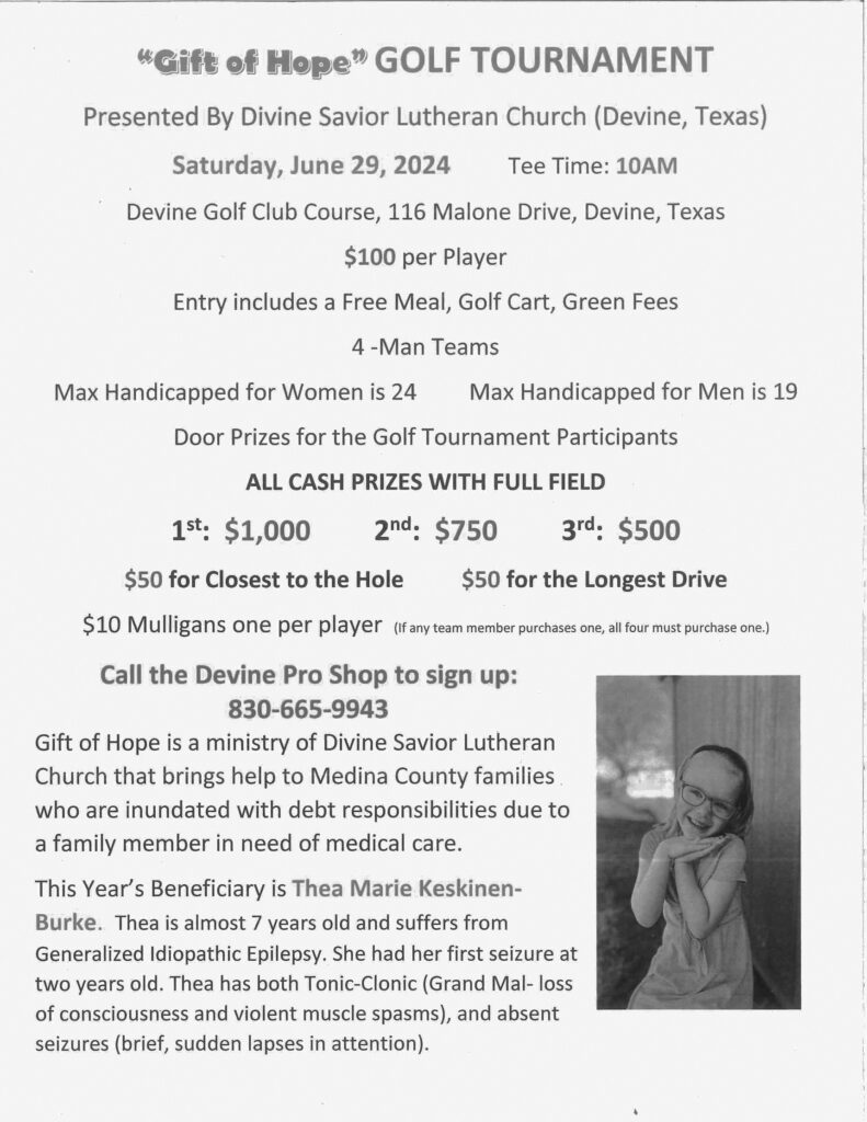 The next step in this journey will be Saturday, June 29th, 2024, at the Devine Golf Course. 116 Malone Drive, Devine, Texas. We need golfers to sign up for this special event $100 per player. This will include a free meal for golfers and cash prizes as well as drawings for free gifts. We are also in need of hole sponsors. These are $125.00 per business or family.
