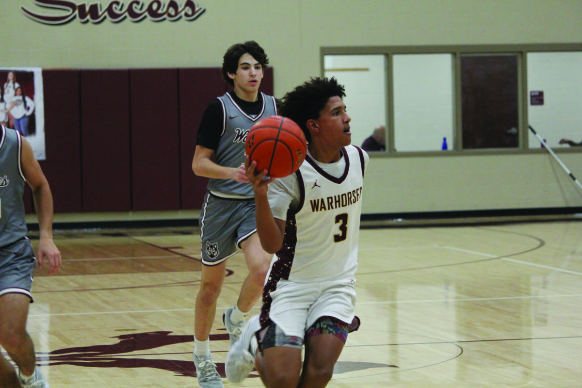 Varsity Warhorse Jordan Beaver looks to dish the ball to the corner in transition during Devine’s game against Davenport. Photo by Moose Lopez.