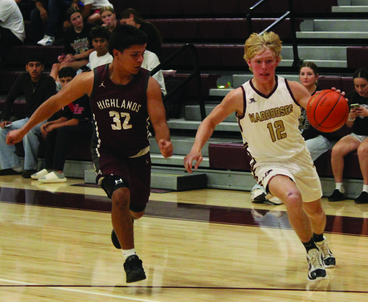 JV Warhorse #12 Enoch Hall drives past his defender for the layup during Devine’s win over Highlands. Photo by Moose Lopez.