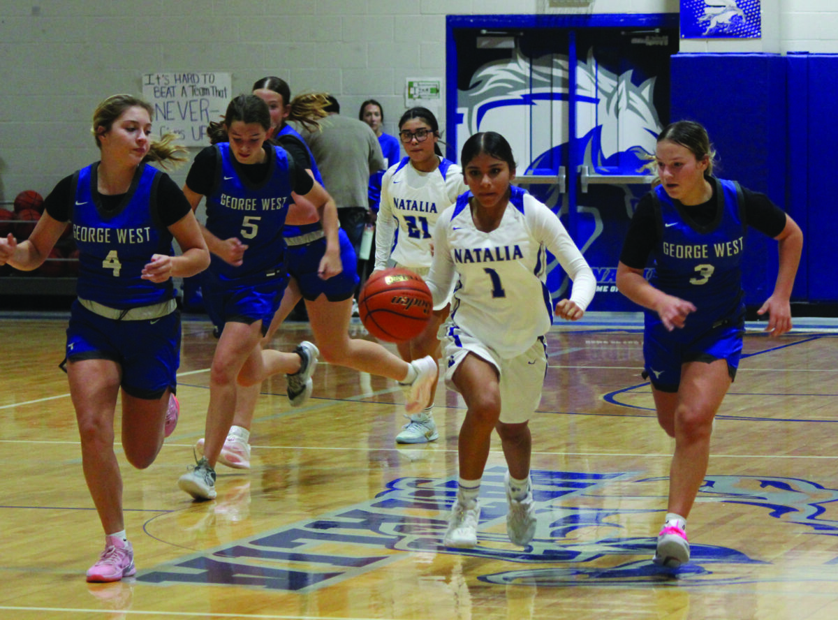 JV Lady Mustang Alyssa Esquibel pushes the ball in transition as the George West players converge on her during Natalia’s first home game of the season. Photo by Moose Lopez.