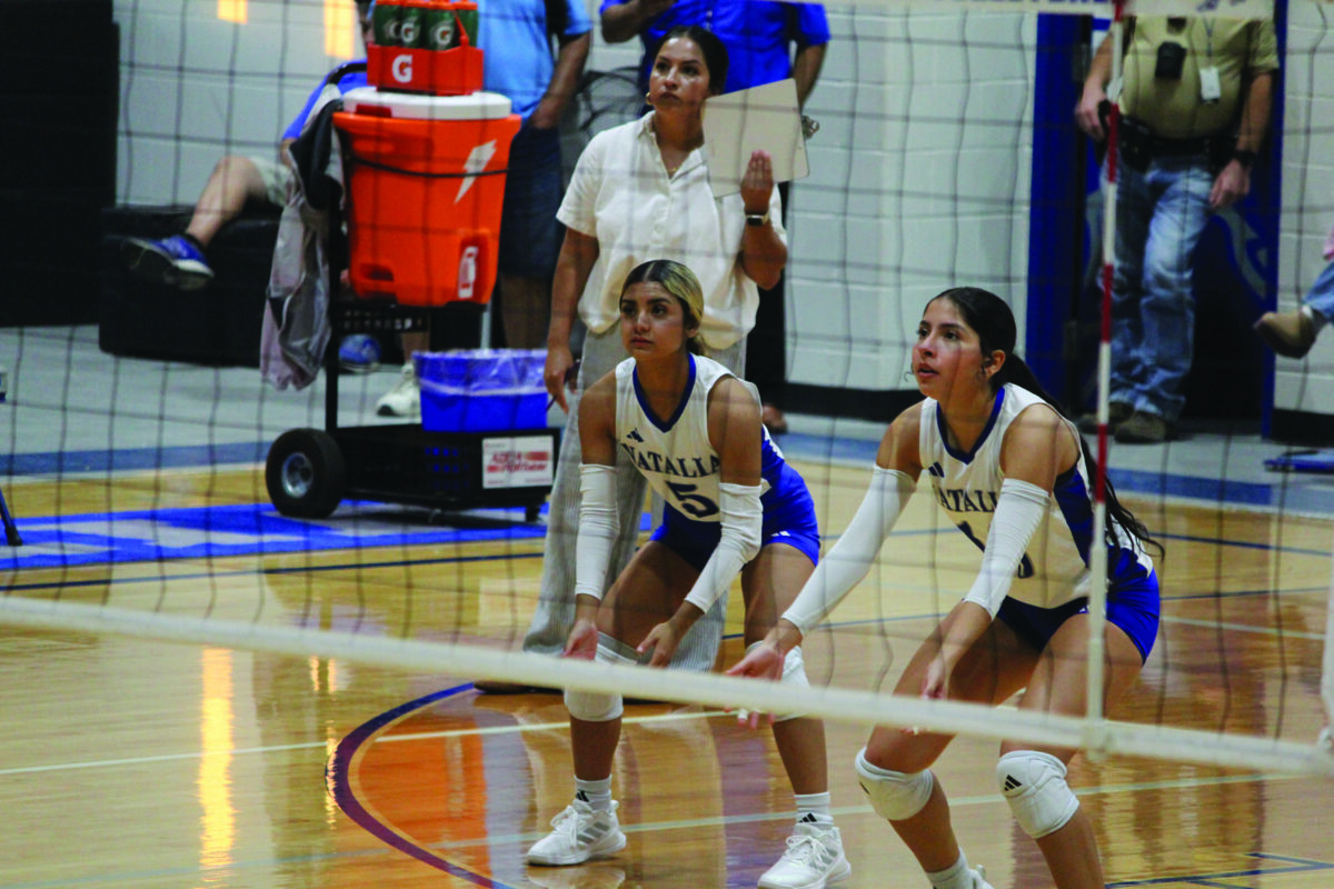 Varisity Lady Mustangs #5 Aryanna Ramirez and #10 Abriella Garza stand ready at the back line during an intense match against Jourdanton. Garza had eight kills against the number one ranked team in district. Photo by Moose Lopez.