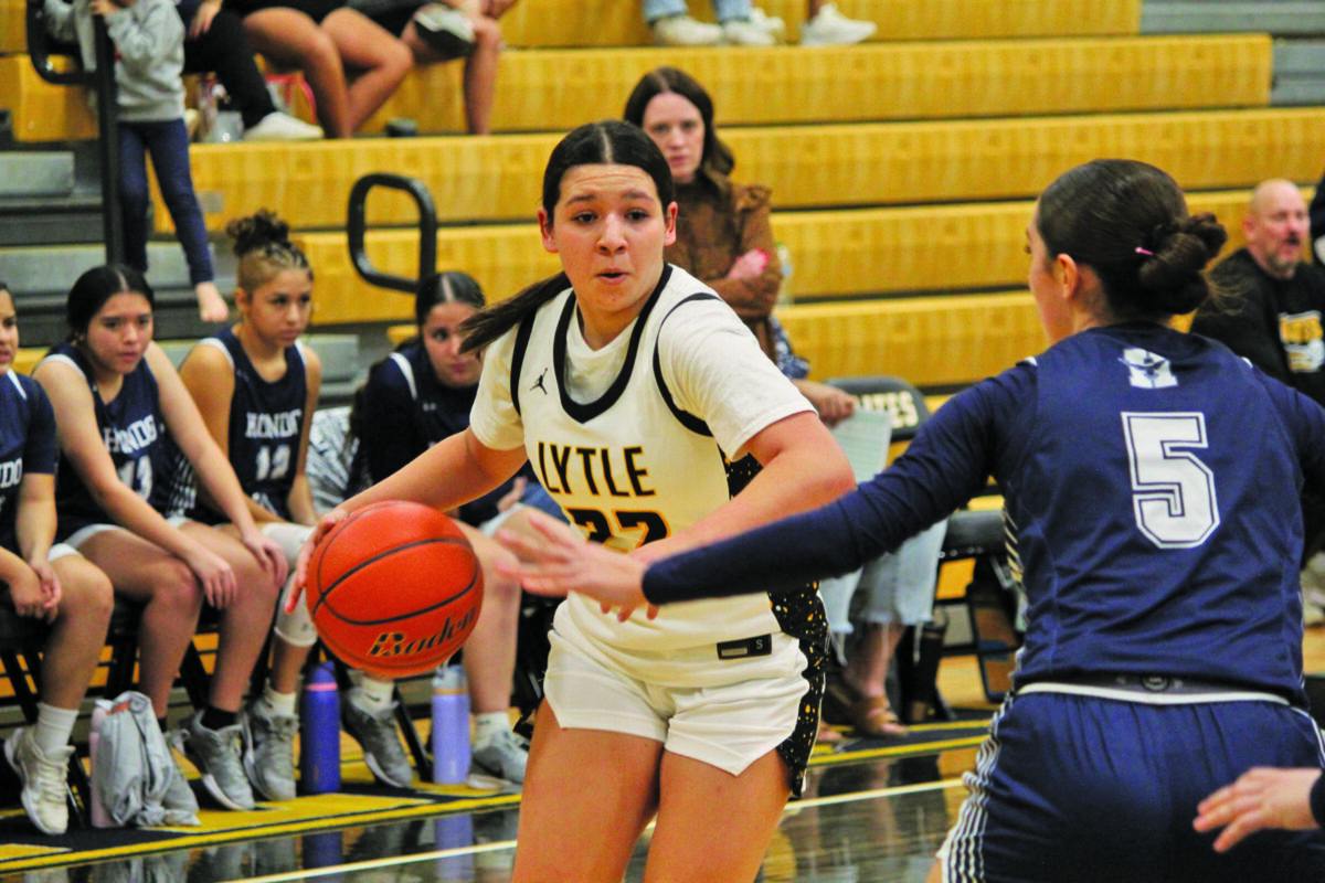 Varsity Lady Pirate #22 Landynn Guzman meets her defender on the baseline during Lytle’s intense game against Hondo. Photo by Moose Lopez.