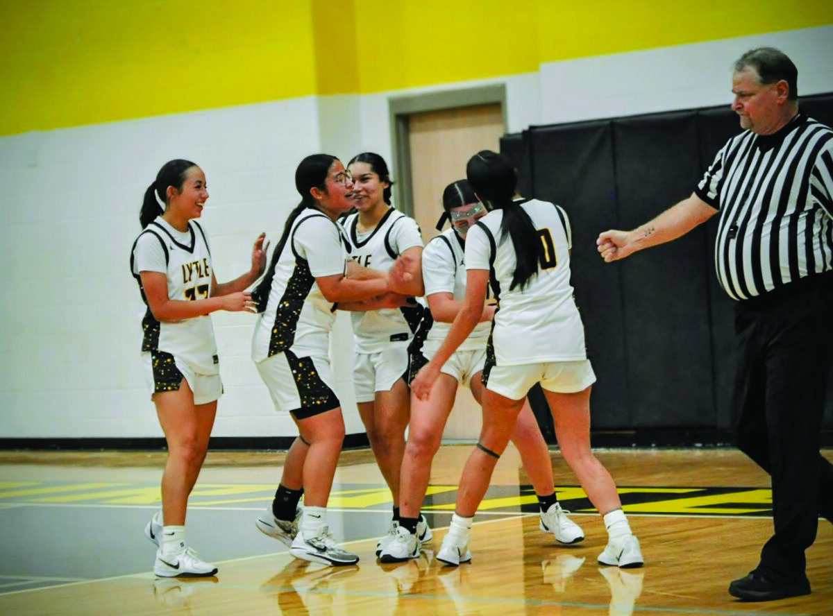 Lytle girls celebrate on the baseline during the Lady Pirates’ first win of the preseason against the Utopia Buffaloes.
