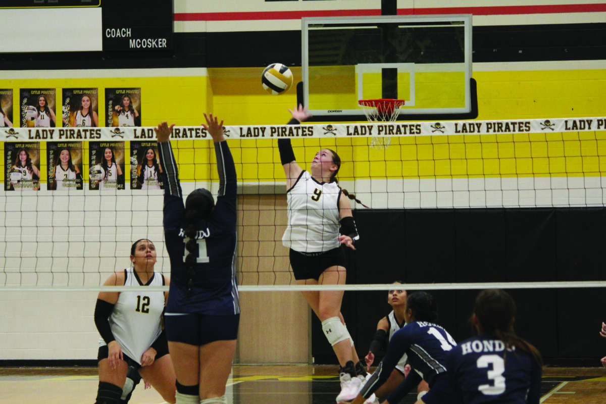 Varsity Lady Pirate #9 Madison Hernandez skies for the spike against Hondo. Photo by Moose Lopez.