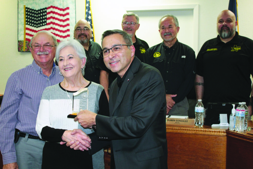 Pam Wanjura, center foreground, was awarded the 2025 Annual Citizenship Award in the adult category with Lytle Mayor Ruben Gonzalez presenting the trophy during the city council meeting Monday.