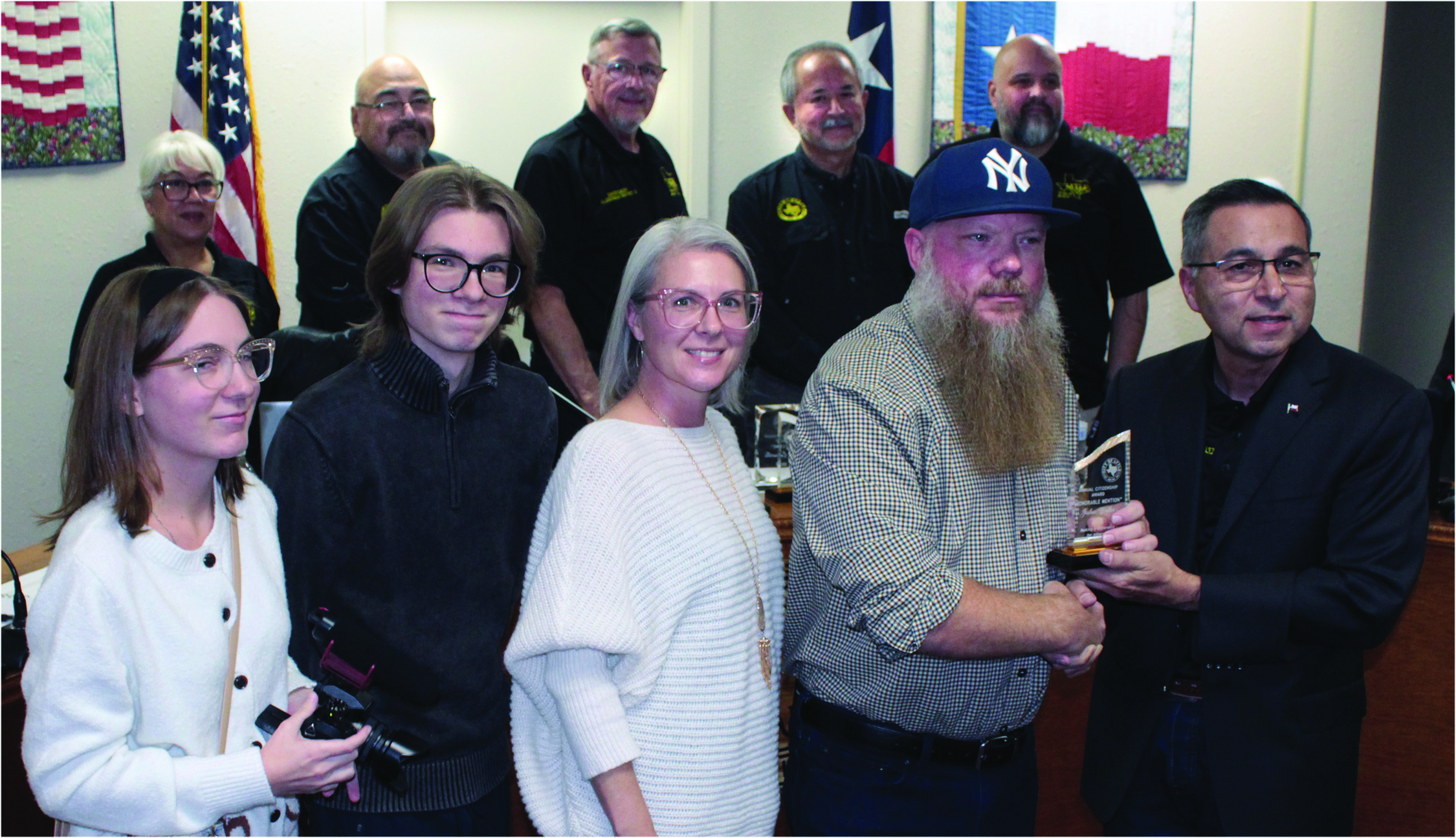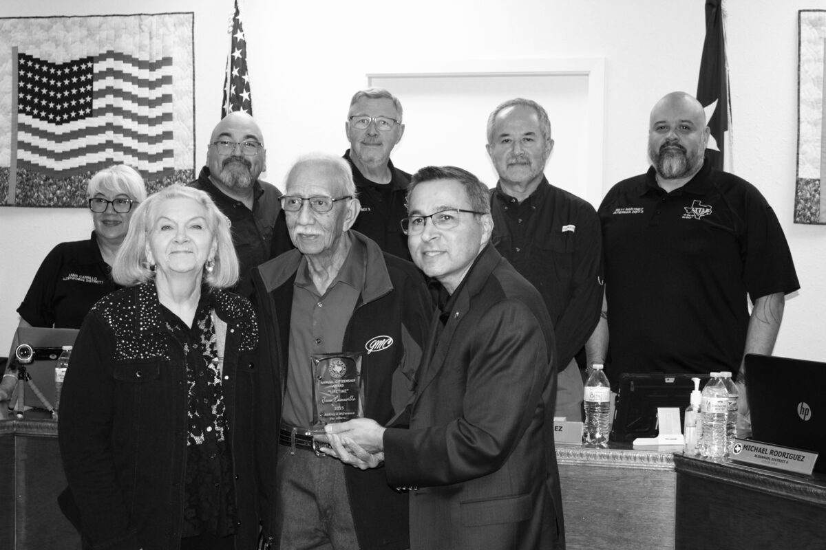 Pam Wanjura, center foreground, was awarded the 2025 Annual Citizenship Award in the adult category with Lytle Mayor Ruben Gonzalez presenting the trophy during the city council meeting Monday.
