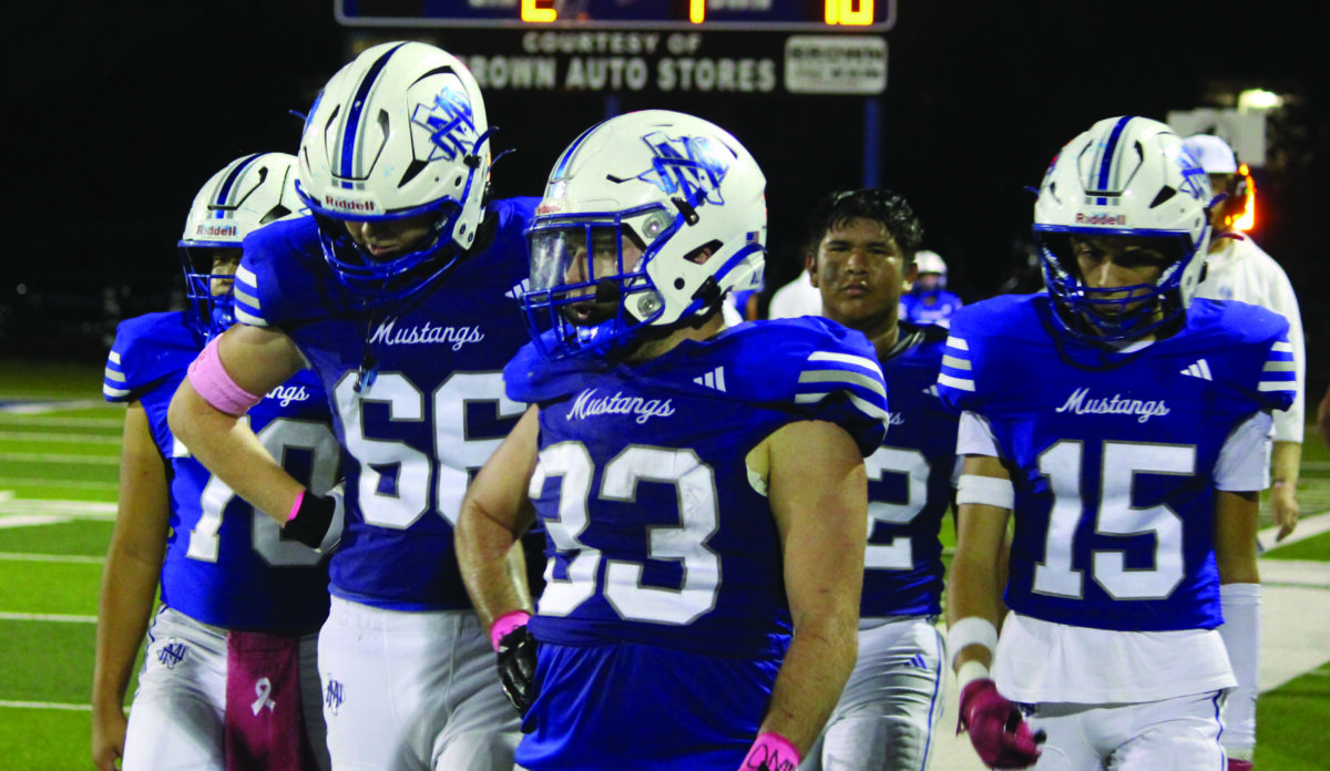 Varsity Mustangs #66 Brayden Berry, #33 Dezel Cashion, #15 Xander Crouch and the rest of the Mustangs walk back to the sidelines after a tough drive against the Crystal City Javelinas. Photo by Moose Lopez.