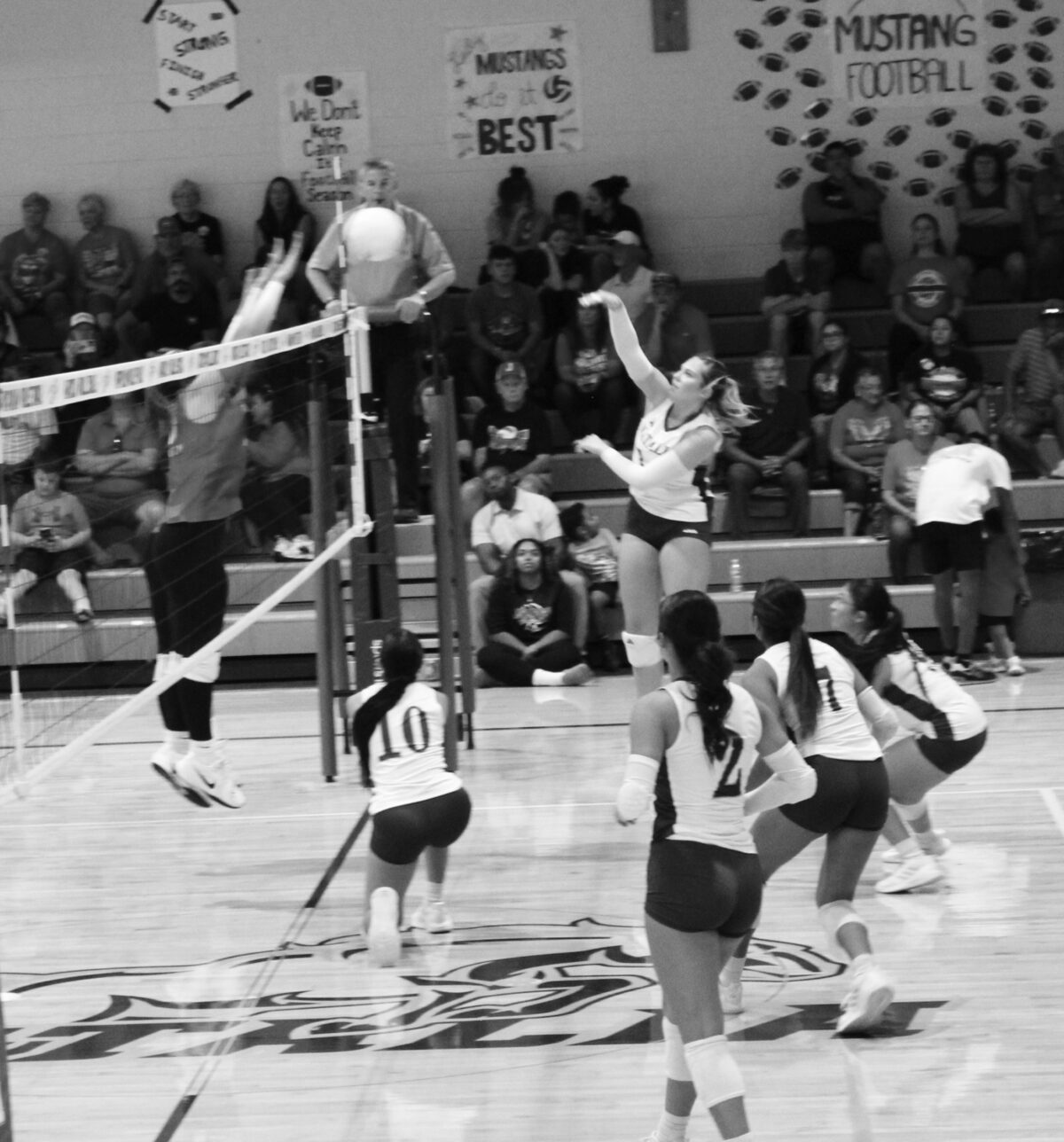 Varsity Lady Mustang #14 Jayden Mello sends the spike over the net while the rest of varsity stands ready to recover just in case. Photo by Mable Byrd.