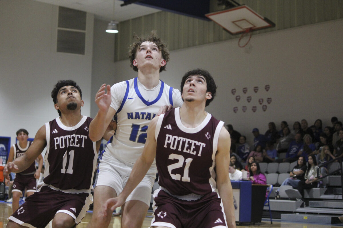 Varsity Mustang #12 Mason Giera boxes out two defenders during Natalia’s game against Poteet. Photo by Moose Lopez.