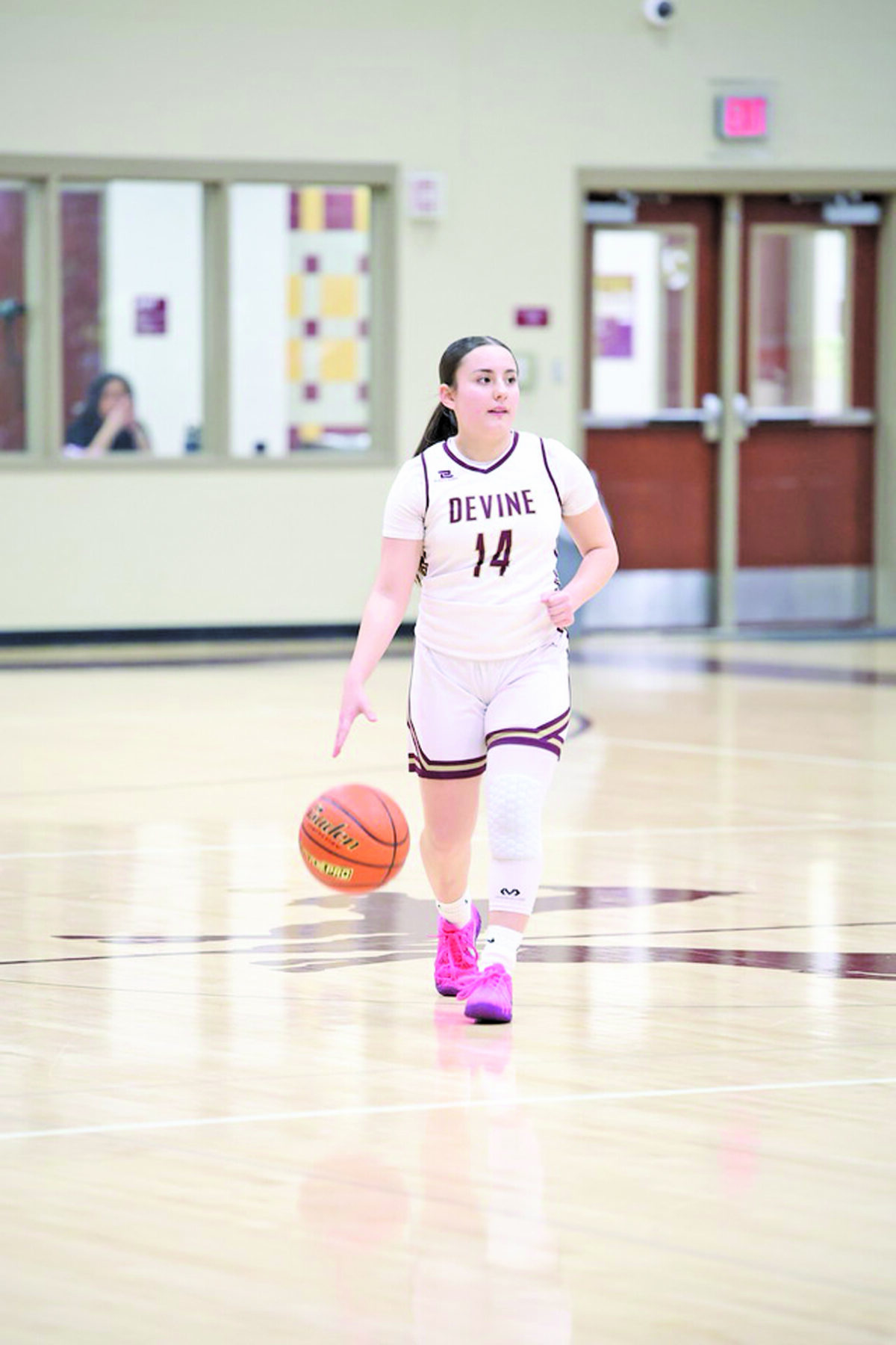 Varsity Arabian Madi De La Garza surveys the offense as she crosses half court during Devine’s game against Pearsall. Photo by Brigid Howard.