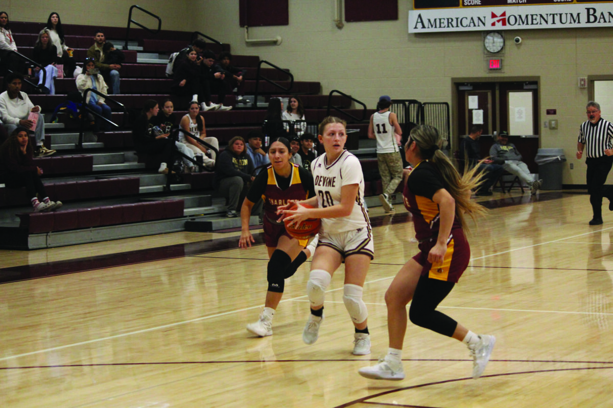 Varsity Arabian #20 Caroline Suhr looks to pass the ball as the defense collapses on her during Devine’s dominant win over Charlotte. Photo by Moose Lopez.