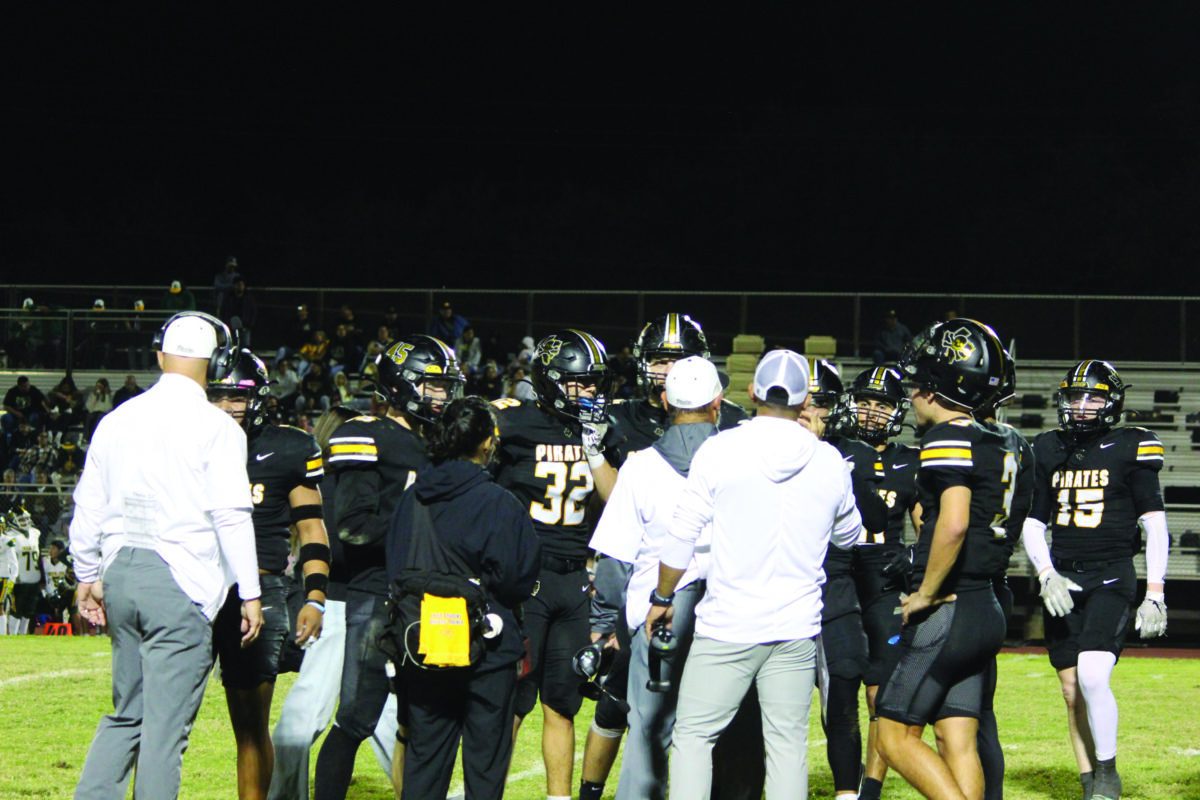 The Varsity Pirates huddle around the coaches during a timeout during an intense game against Crystal City. Photo by Moose Lopez.