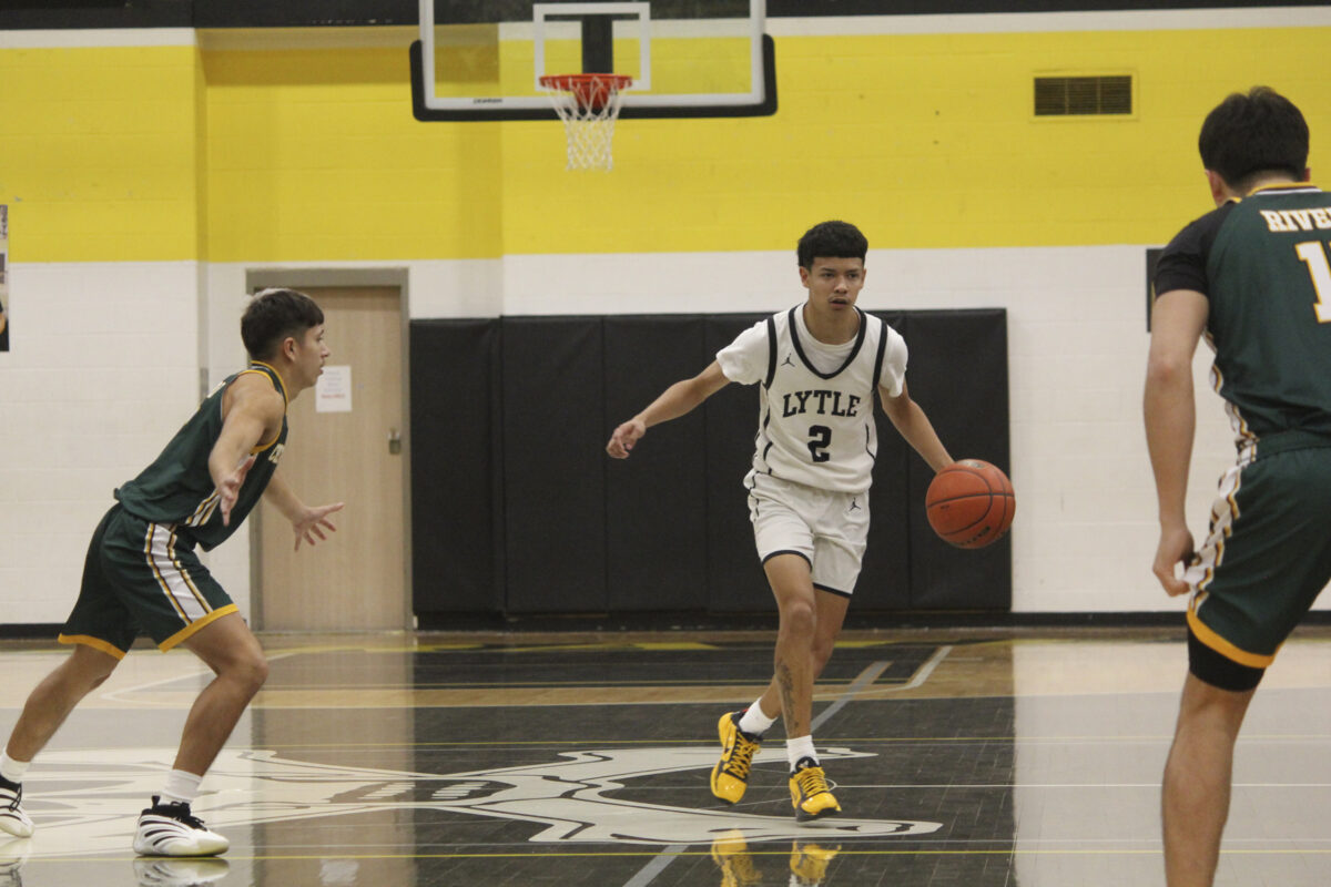Varsity Pirate #2 Chase Guevara prepares for the change of pace as he dribbles up the court during Lytle’s thrilling game against Crystal City. Photo by Moose Lopez.