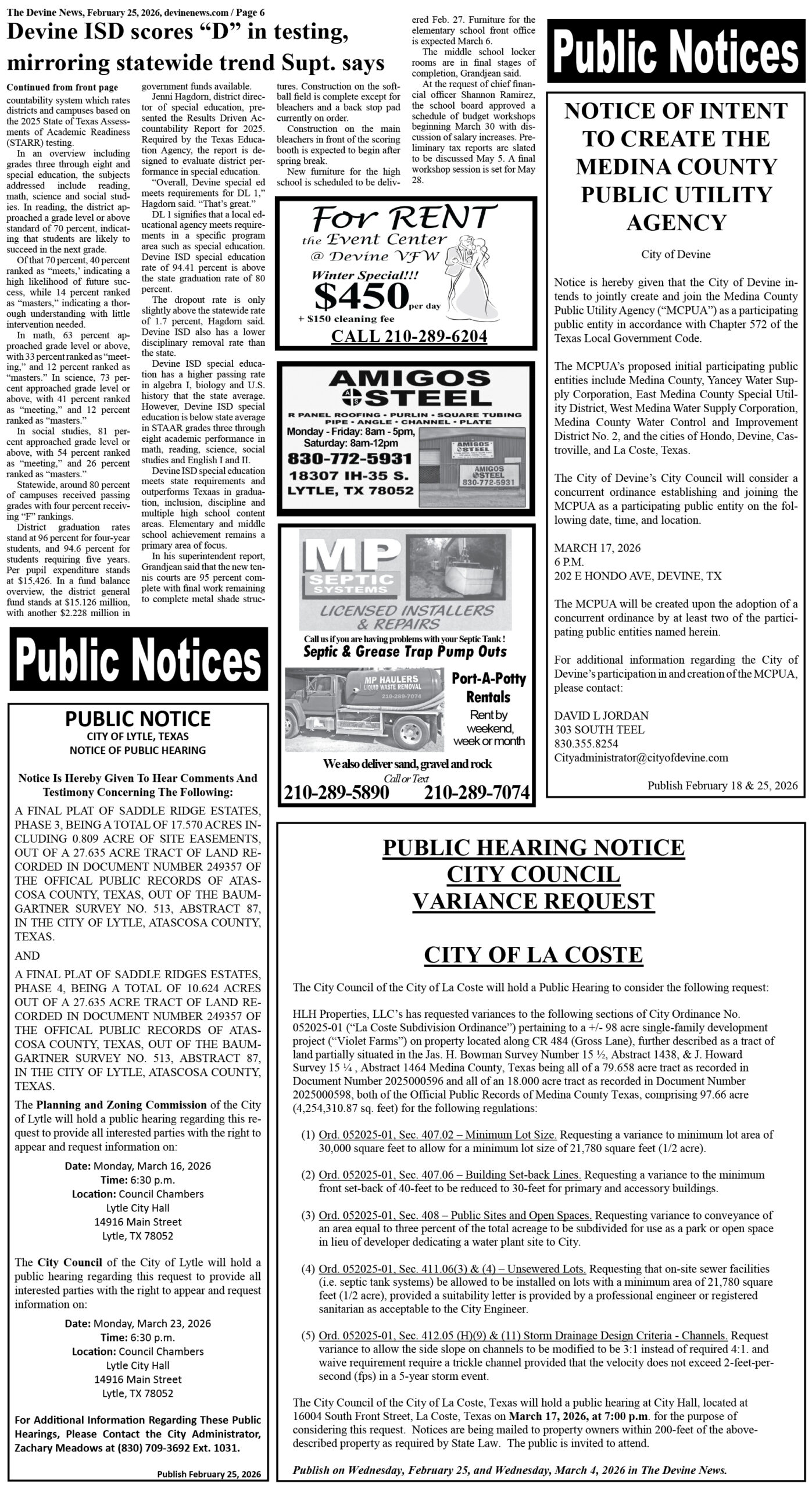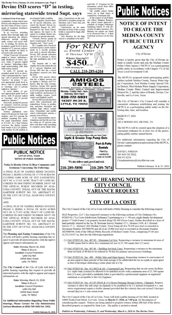 City of Devine Tax Notice – Tax increase Public Hearing Devine