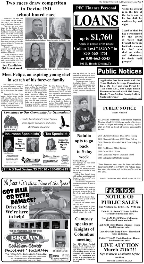 Please publish in the Devine News on September 6, 2023