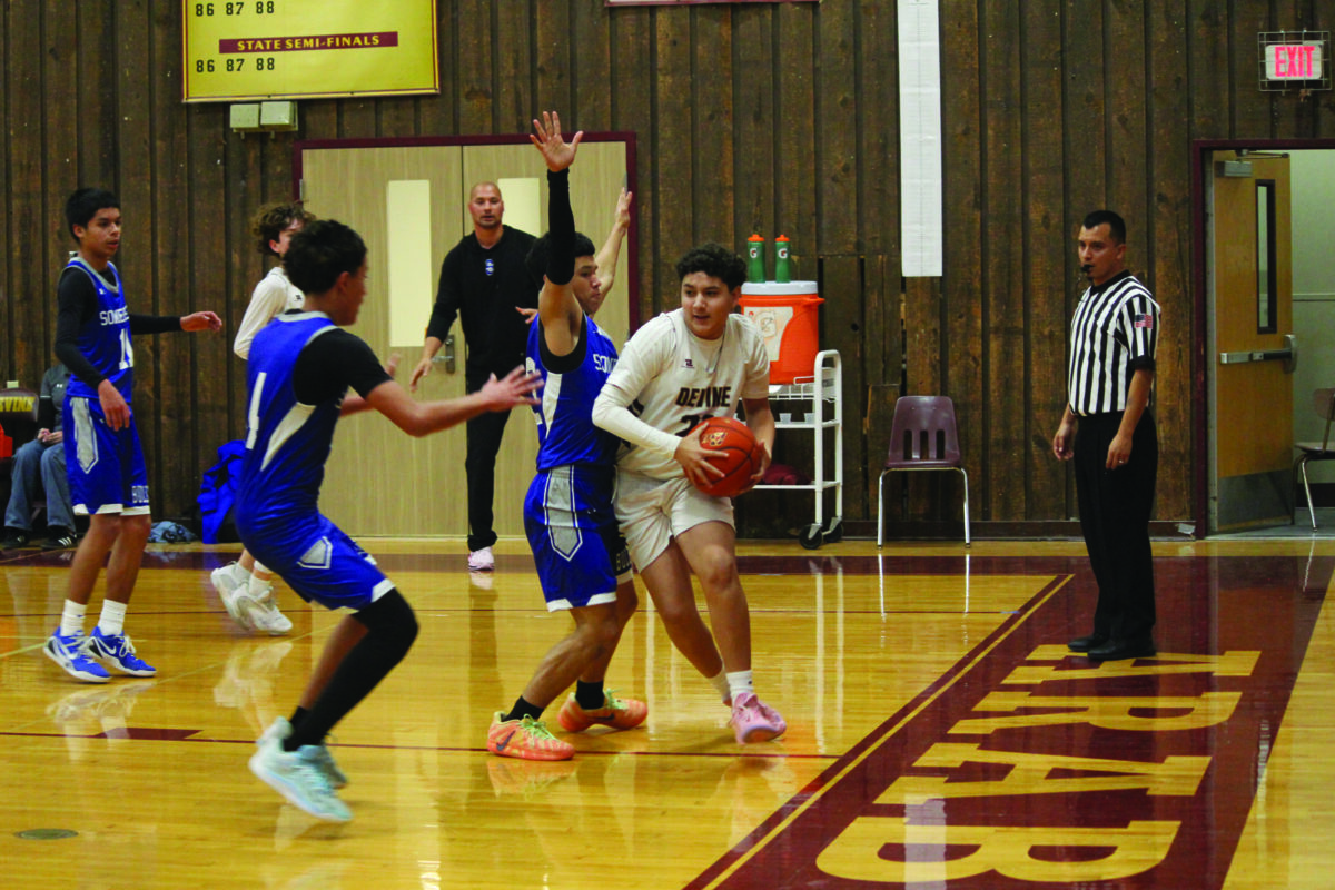 Freshman Warhorse #21 Stephen Caballero muscles his way to the baseline during Devine’s thrilling game against Somerset. Caballero secured one board during this game. Photo by Moose Lopez.
