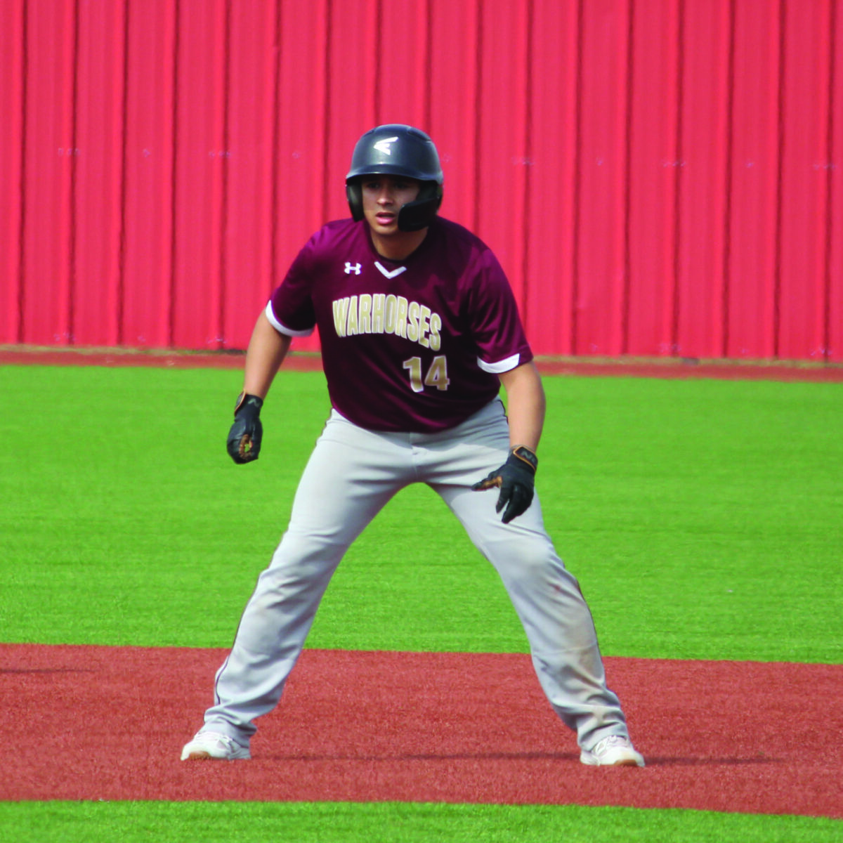 Warhorse Gerardo Villasenor watches the pitch as he inches between second and third base. Photo by Moose Lopez.